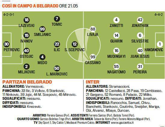 PARTIZAN BELGRADO INTER PROBABILI FORMAZIONI – Poco più in basso potete visionare le probabili formazioni di Partizan Belgrado-Inter, firmate Gazzetta dello Sport, match valevole per il quarto turno dei Gironi di Europa League. Stramaccioni pensa ad inedito 4-4-2 con Cassano e Livaja in attacco, Silvestre al centro difesa, e sulle corsie Jonathan e Pereira. A centrocampo Zanetti e Nagatomo larghi sugli esterni con Guarin e Mudingayi diga fra difesa e attacco. Infine, Handanovic, a curare la porta nerazzurra.