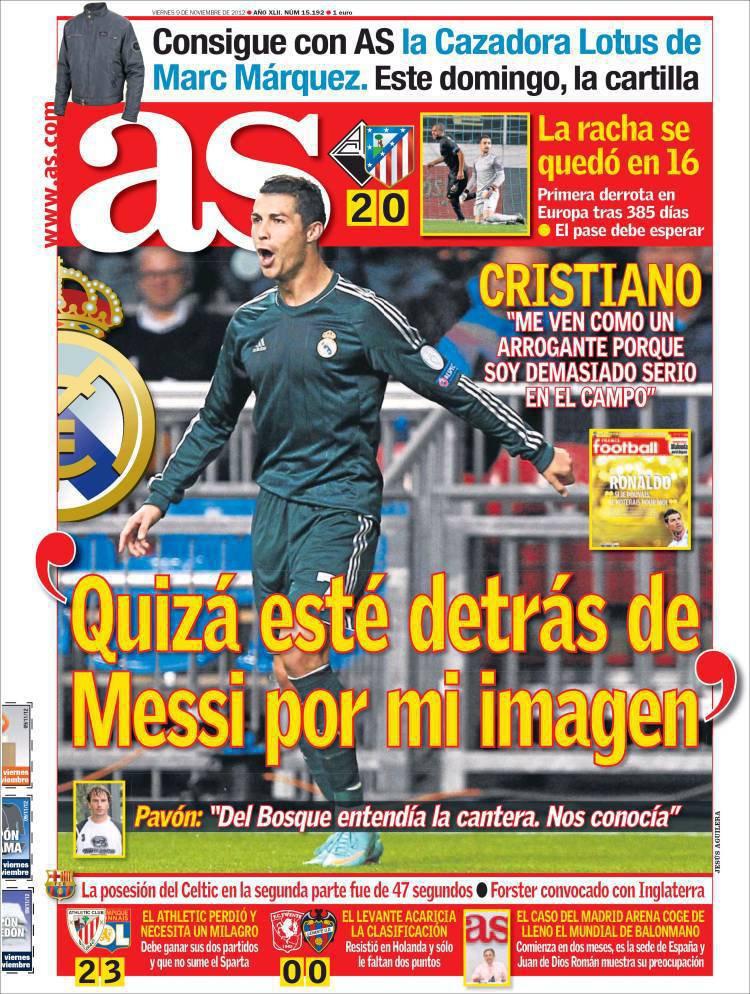 AS MESSI – Sul quotidiano As si parla di Ronaldo che rivela di essere visto arrogante perché in campo è serio.