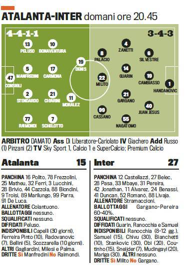 ATALANTA INTER PROBABILI FORMAZIONI – Poco più in basso potrete visionare le probabili formazioni di Atalanta-Inter, firmate Gazzetta dello Sport. I nerazzurri, dopo la grande prestazione in Europa League di Belgrado contro il Partizan, puntano a violare anche l’Atleti Azzurri d’Italia di Bergamo, sperando magari in un passo falso della Juventus, impegnata questa sera a Pescara. Stramaccioni dovrebbe rischierare il 3-4-3 con il trio delle meraviglie, Palacio-Milito-Cassano davanti. Silvestre potrebbe partire da titolare viste le moltissime assenze in difesa.