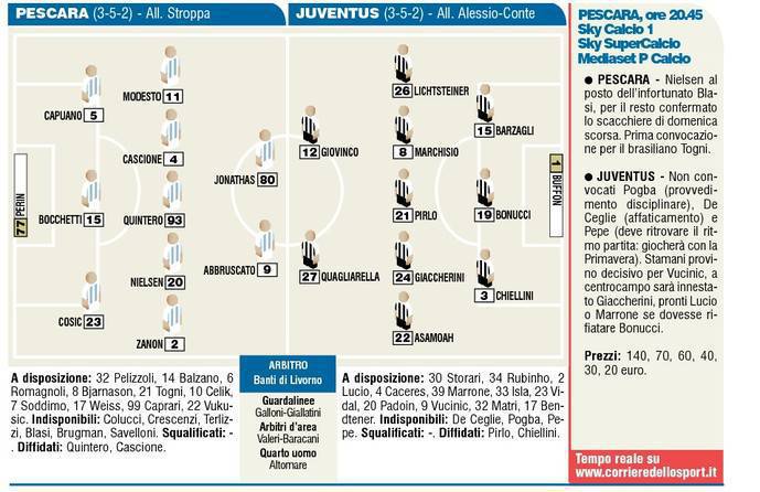 PESCARA JUVENTUS PROBABILI FORMAZIONI – Poco più in basso potrete visionare le probabili formazioni di Pescara-Juventus, anticipo della dodicesima giornata di Serie A che si giocherà questa sera alle ore 20.45 allo stadio Adriatico in Abruzzo. Dopo la grande vittoria in Champions League contro il Nordsjaelland, la Vecchia Signora vuole tornare a vincere anche in campionato, essendo reduce dalla capitolazione interna contro l’Inter di sabato scorso. Conte sceglie Quagliarella e Giovinco per l’attacco con la probabile novità Giaccherini al posto di Vidal. Sulla destra ci sarà Lichtsteiner.