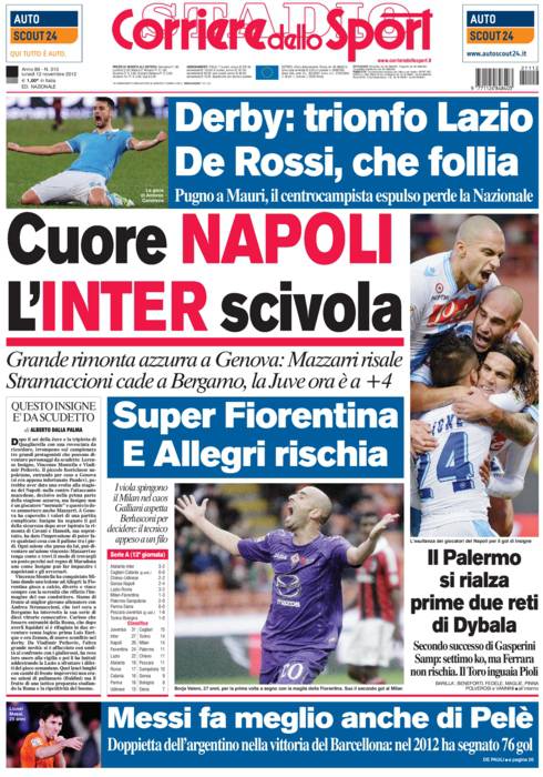 Corriere dello Sport: Cuore Napoli l’Inter scivola 12/11/2012 di Admin3 CORRIERE NAPOLI INTER – Sul Corriere dello Sport si parla della vittoria del Napoli contro il Genoa. La redazione di Calciomercatonews.com