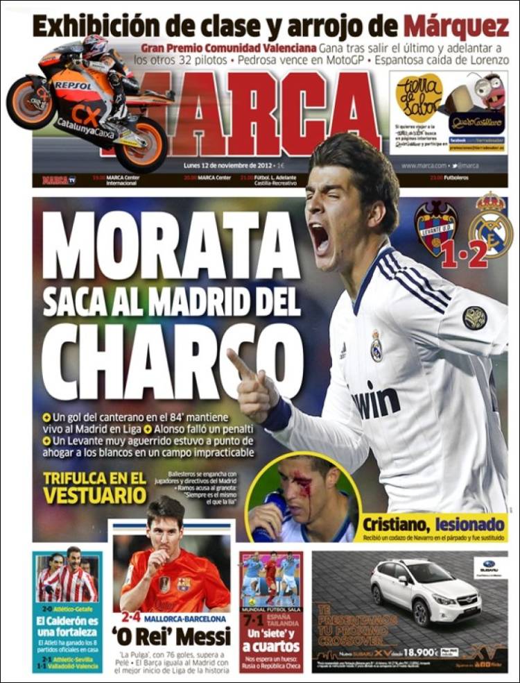 Marca: Morata prende il Real Madrid per mano 12/11/2012 di Admin3 MARCA MORATA – Sul quotidiano Marca si parla del giovane Morata che aiuta a vincere il Real Madrid contro il Levante. La redazione di Calciomercatonews.com