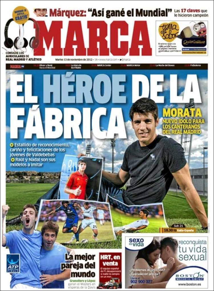 Marca: L’eroe della fabbrica 13/11/2012 di Admin3 MARCA MORATA – Sul quotidiano Marca si parla di Morata, giocatore della Cantera del Real Madrid, decisivo contro il Levante. La redazione di Calciomercatonews.com