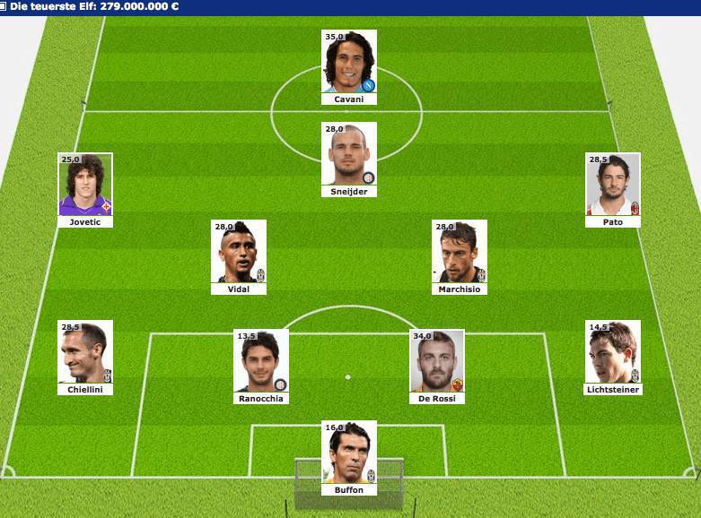 CALCIOMERCATO SERIE A 11 COSTOSO FOTO – Il sito tedesco transfermarkt.de, ha postato la squadra dei giocatori della Serie A più costosa. Una squadra da urlo con il modulo 4-2-3-1 con Buffon in porta, difesa a quattro con Lichtsteiner a destra, Ranocchia e De Rossi difensori centrali, Chiellini a sinistra. Centrocampo a due con Vidal e Marchisio, tre trequartisti con Pato largo a destra, Sneijder centrale e Jovetic a sinistra. In attacco il grande Cavani. Il più costoso è proprio il Matador che secondo il sito tedesco vale 35 milioni di euro anche se ha una clausola rescissoria da 60 milioni di euro. Sorpresa Pato che ha un valore importante. Ecco la foto.