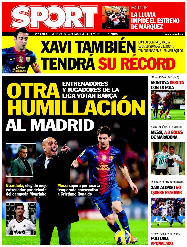 Sport: Altra umiliazione per il Real Madrid 14/11/2012 di Admin3 SPORT REAL MADRID – Il quotidiano Sport parla del Barcellona che è stato votato dai giocatori della Liga come migliore squadra della scorsa stagione. La redazione di Calciomercatonews.com
