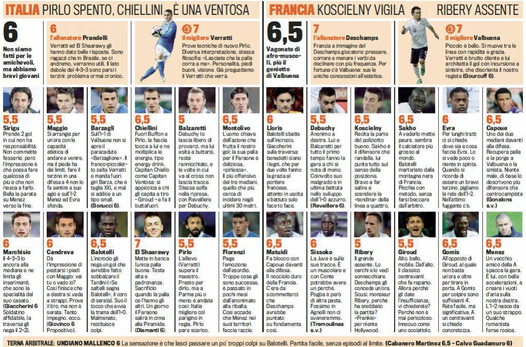 ITALIA FRANCIA VOTI PAGELLE GAZZETTA SPORT – Di seguito potete visionare i voti e le pagelle Gazzetta dello Sport relativi alla sfida amichevole fra Italia e Francia, gara giocatasi ieri sera allo stadio Tardini di Parma e conclusasi con il risultato di 2 a 1 in favore dei transalpini. Ottima prova dei giovani talenti azzurri, a cominciare da Marco Verratti, il migliore in assoluto fra i suoi, passando per Stephan El Shaarawy, ieri al primo gol in azzurro, arrivando fino al solito Mario Balotelli.