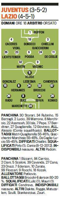 JUVENTUS LAZIO PROBABILI FORMAZIONI – Poco più in basso potete visionare le probabili formazioni di Juventus-Lazio, firmate Gazzetta dello Sport, match valevole per il l’anticipo delle ore 18.00 di domani sera, valevole per la tredicesima giornata di Serie A. Vista l’assenza per squalifica di Pirlo, mister Antonio Conte punterà sul talentuoso Paul Pogba. In attacco dovrebbero invece giocare Matri e Vucinic, mentre sugli esterni spazio a Lichtsteiner sulla destra e a De Ceglie sulla sinistra. In casa Lazio assenti Lulic e Mauri, entrambi squalificati.