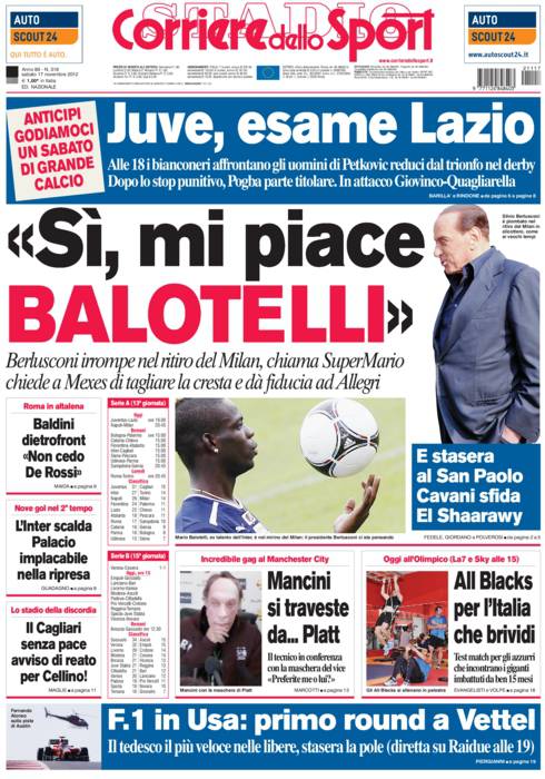Corriere dello Sport: “Si, mi piace Balotelli” 17/11/2012 di Admin3 CORRIERE BALOTELLI – Sul Corriere dello Sport si parla di Berlusconi che ha dichiarato di avere una simpatia per Balotelli. La redazione di Calciomercatonews.com