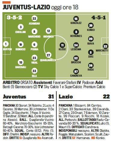 JUVENTUS LAZIO PROBABILI FORMAZIONI – Poco più in basso potete visionare le probabili formazioni di Juventus-Lazio, firmate Gazzetta dello Sport, match valevole per l’anticipo delle 18.00 di domani, tredicesimo turno di Serie A. Mister Antonio Conte dovrà rinunciare ad Andrea Pirlo, squalificato, e al suo posto giocherà con grande probabilità Paul Pogba, precedentemente non convocato per la sfida contro il Pescara di sabato scorso. In attacco dovrebbe giocare la coppia Giovinco-Quagliarella, mentre sulla destra favorito Lichtsteiner su Isla.