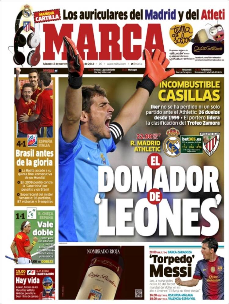 Marca: Il domatore dei leoni 17/11/2012 di Admin3 MARCA DOMATORE – Sul quotidiano Marca si parla di Casillas che cercherà di fermare Falcao. La redazione di Calciomercatonews.com