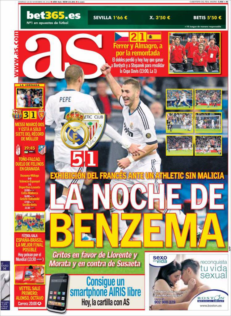 RASSEGNA STAMPA AS – Questa mattina il quotidiano iberico As apre con la straripante vittoria del Real Madrid ai danni dell’Athletic Bilbao. A porre due volte la firma su questo successo ci ha pensato Karim Benzema, autore di una doppietta siglata nel primo tempo. Ramos, Ozil e Khedira gli altri marcatori dei Blancos.