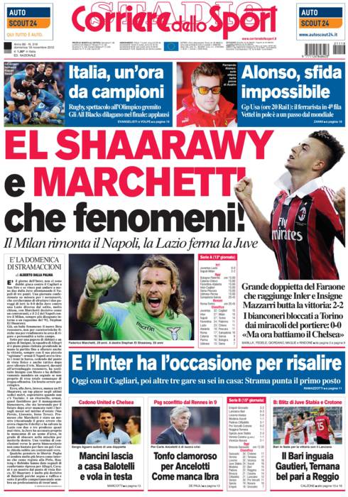 RASSEGNA STAMPA CORRIERE DELLO SPORT – Due pareggi negli anticipi di ieri sera. Ma se Juventus e Napoli non sono riusciti ad andare oltre il pari, il merito va soprattutto a Federico Marchetti e Stephan El Shaarawy. Il primo a letteralmente blindato la porta della Lazio negando più volte la gioia del gol ai bianconeri; il secondo ha firmato la rimonta del Milan con una doppietta. Ed entrambi sono finiti in copertina sul Corriere dello Sport.