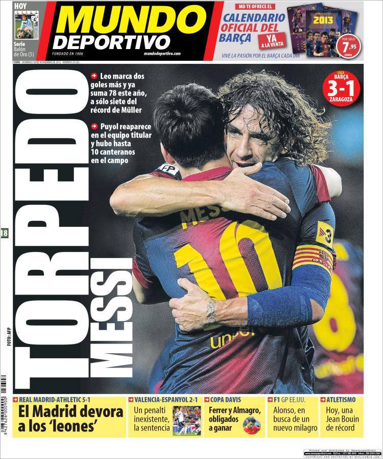 RASSEGNA STAMPA MUNDO DEPORTIVO – Lionel Messi sembra sempre più vicino ad aggiudicarsi il quarto Pallone d’Oro della sua carriera. Ieri sera, nella sfida contro il Real Saragozza, la Pulce ha messo a segno un’altra doppietta che ha permesso ai blaugrana di ottenere i tre punti vincendo per 3-1. E Mundo Deportivo dedica a Messi la copertina di oggi.