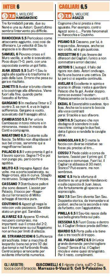 INTER CAGLIARI VOTI PAGELLE GAZZETTA – Di seguito potete visionare i voti e le pagelle Gazzetta dello Sport relativi alla sfida fra l’Inter e il Cagliari, gara valevole per il tredicesimo turno della Serie A, stagione 2012-2013, e conclusasi con il risultato di 2 a 2 non senza polemiche per via di alcune sviste arbitrali nei confronti dell’Inter. Il migliore dell’incontro in assoluto è stato Samir Handanovic, premiato con un 7, ma l’attenzione è rivolta alla direzione arbitrale ed in particolare all’operato di Giacomelli, bocciato gravemente con un eloquente 4 dalla Rosea.