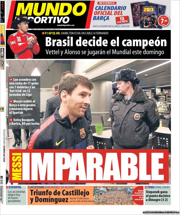 Mundo Deportivo: Messi impareggiabile 19/11/2012 di Admin3 MUNDO DEPORTIVO MESSI – Sul quotidiano Mundo Deportivo si parla di Messi che è impareggiabile vista la media gol spaventosa. La redazione di Calciomercatonews.com