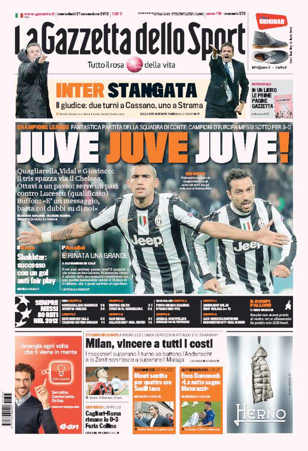GAZZETTA JUVENTUS – Sulla Gazzetta dello Sport si parla della Juventus che vince tre a zero contro il Chelsea.