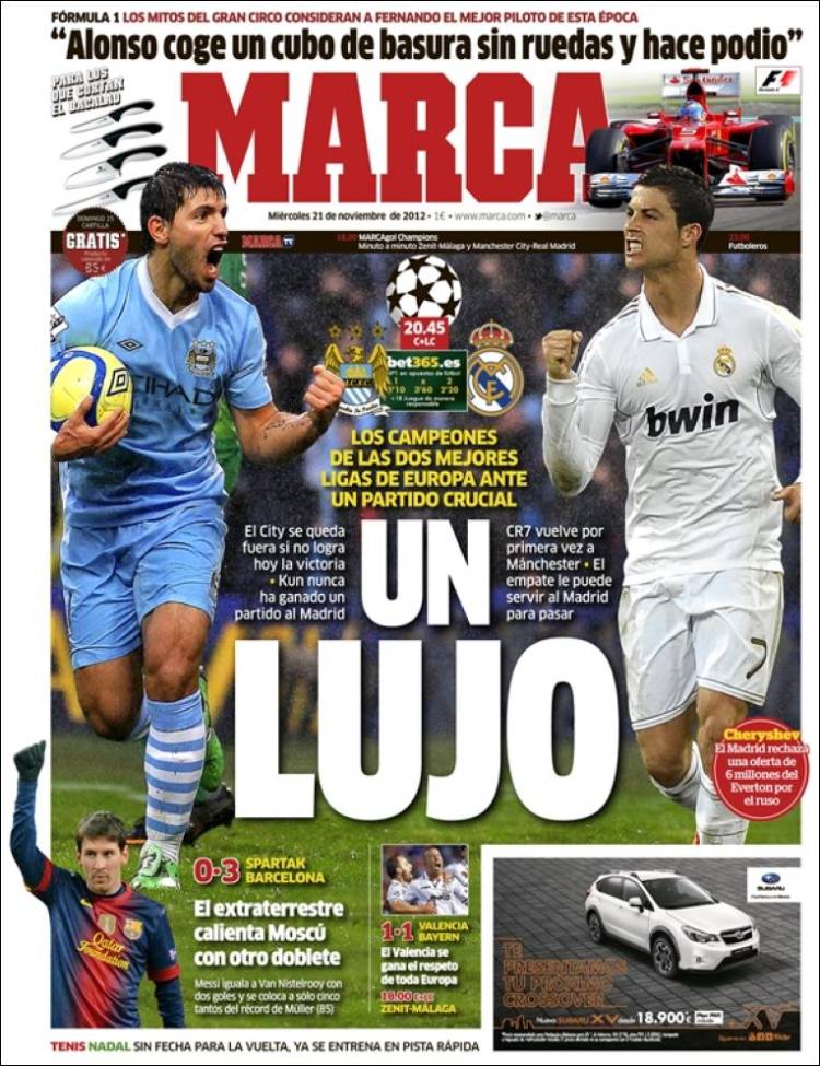 Marca: Un lusso 21/11/2012 di Admin3 MARCA REAL MADRID – Grande sfida a Manchester tra il City di Mancini e il Real Madrid di Mourinho. La redazione di Calciomercatonews.com