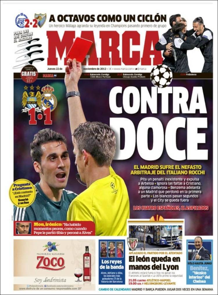 MARCA REAL MADRID – Il Real Madrid si qualifica come secondo perché pareggia contro il Manchester City. Critiche sull’arbitraggio di Rocchi.