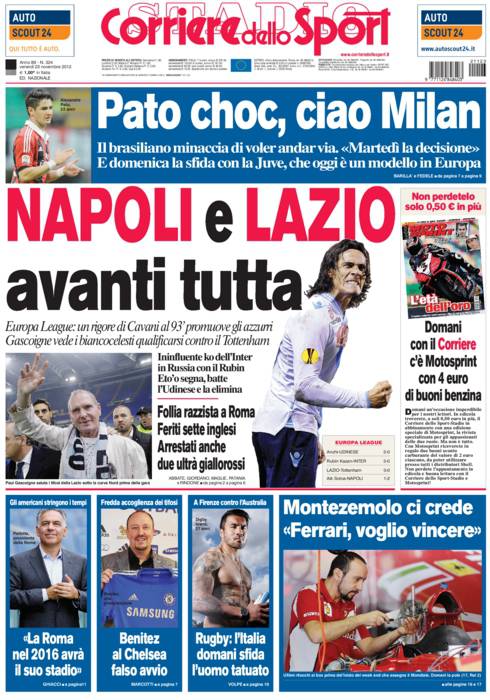 Corriere dello Sport: Napoli e Lazio avanti tutta 23/11/2012 di Admin3 CORRIERE NAPOLI LAZIO – Sul Corriere dello Sport si parla di Napoli e Lazio che si qualificano in Europa League così come l’Inter. Fuori l’Udinese. la redazione di Calciomercatonews.com