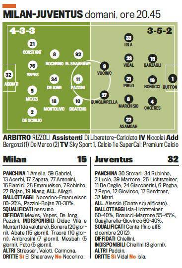 MILAN JUVENTUS PROBABILI FORMAZIONI – Poco più in basso potrete visionare le probabili formazioni di Milan-Juventus firmate Gazzetta dello Sport. La gara sarà valida per il posticipo di domenica sera delle ore 20.45, quattordicesima giornata di Serie A. Milan alle prese con le assenze probabili di Ambrosini e Pato mentre ci sarà Mexes. In casa Juventus, invece, c’è da fare i conti con gli acciacchi di Chiellini (problemi al polpaccio), e di Leonardo Bonucci, che ieri non si è allenato per via di un’influenza.