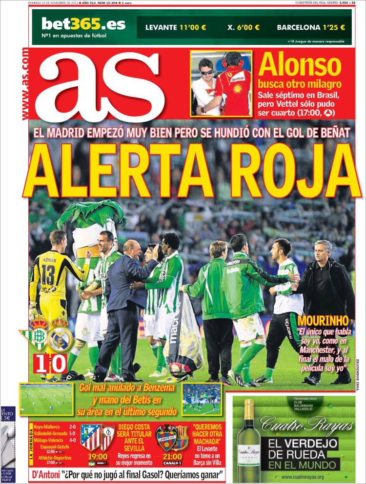 RASSEGNA STAMPA REAL MADRID – Allarme rosso in casa Real Madrid. Nonostante un’ottima partenza, la squadra di Mourinho non è riuscita ad imporsi ed è stata battuta dal Real Betis grazie al gol firmato da De Benat. Mourinho: “L’unico responsabile sono io, come a Manchester”.