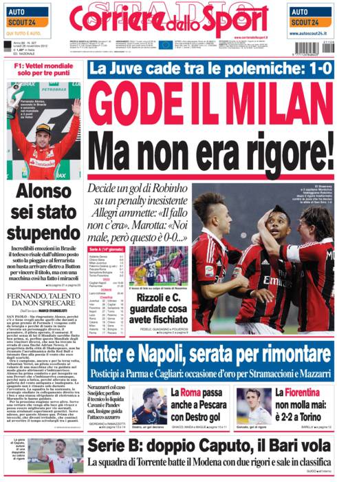 Corriere dello Sport: Gode il Milan, ma non era rigore 26/11/2012 di Admin3 CORRIERE MILAN – Sul Corriere dello Sport si parla del Milan che vince uno a zero contro la Juventus con un rigore che non c’era. La redazione di Calciomercatonews.com