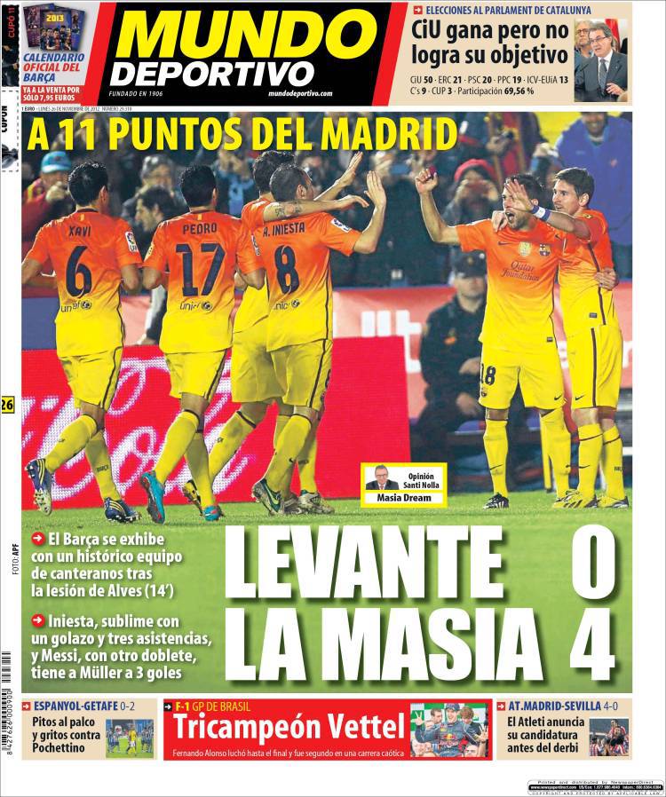 Mundo Deportivo: Levante 0-La casa 4 26/11/2012 di Admin3 MUNDO DEPORTIVO BARCELLONA – Il Barcellona batte quattro a zero il Levante con una squadra di 11 canterani. La redazione di Calciomercatonews.com