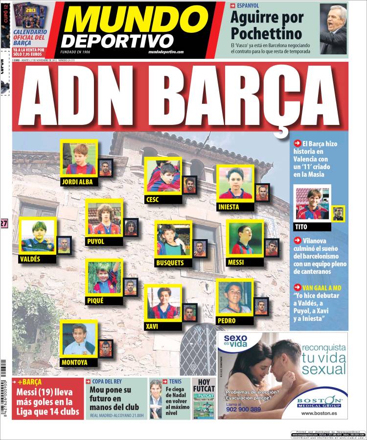 Mundo Deportivo: Dna Barça 27/11/2012 di Admin3 MUNDO DEPORTIVO BARCELLONA – Il quotidiano Mundo Deportivo riporta la foto dell’attuale squadra del Barcellona di quando erano ragazzi. Tutti provenienti dalla Cantera. La redazione di Calciomercatonews.com