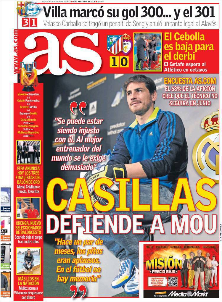 As: Casillas difende Mourinho 29/11/2012 di Admin3 AS CASILLAS – Sul quotidiano As si parla di Casillas che difende Mourinho dalle critiche. La redazione di Calciomercatonews.com