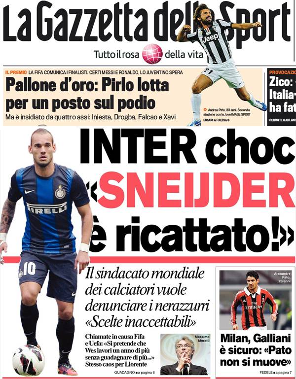 RASSEGNA STAMPA – Di seguito i principali titoli dei tre quotidiani sportivi di oggi. Si parla di Pirlo-Pallone d’Oro, Sneijder ricattato, e Milan-Pato.