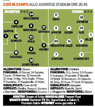 JUVENTUS TORINO PROBABILI FORMAZIONI – Più in basso potete trovare le probabili formazioni del derby piemontese Juventus-Torino firmate Gazzetta dello Sport, gara valevole per il posticipo della ore 20.45 del sabato, quindicesima giornata di Serie A. Mister Antonio Conte dovrebbe puntare su un 3-5-2 con coppia d’attacco Vucinic-Giovinco mentre sulla destra sembra favorito l’ex Lazio Lichtsteiner su Mauricio Isla, quest’ultimo, uno dei peggiore durante il match contro il Milan. A centrocampo dubbi riguardante Vidal, che è stato convocato ma che non è al meglio. In caso di forfeit dovrebbe giocare il giovane talento Paul Pogba.