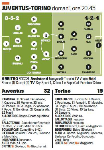 JUVENTUS TORINO PROBABILI FORMAZIONI – Di seguito potete visionare le probabili formazioni di Juventus-Torino, sfida che si giocherà domani sera, alle ore 20.45, in quello dello Juventus Stadium di Torino, anticipo della quindicesima giornata di Serie A. Conte dovrebbe puntare sulla coppia Vucinic-Giovinco in attacco bocciando di fatto Quagliarella. Novità Vidal che prenderà il posto di Vidal, infortunato, mentre sulla destra favorito Lichtsteiner su Isla. Resto della formazione come da copione. Toro, invece, con il solito 4-2-4 con Bianchi e Meggiorini a guidare l’attacco supportati da Cerci e Santana.