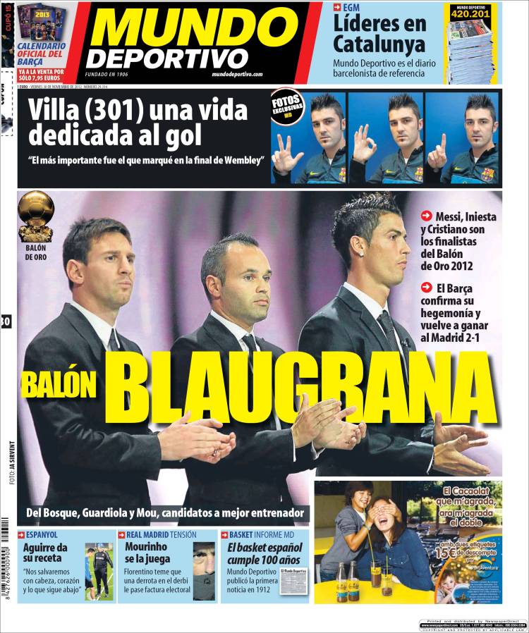 Mundo Deportivo: Pallone d’Oro blaugrana 30/11/2012 di Admin3 MUNDO DEPORTIVO PALLONE D’ORO – Sul quotidano Mundo Deportivo si parla del Pallone d’Oro con due giocatori del Barcellona sul podio. La redazione di Calciomercatonews.com
