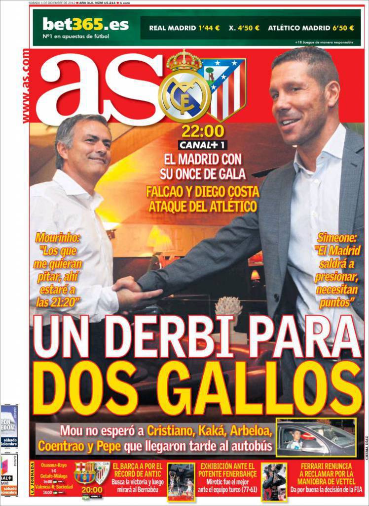 AS DERBY – Sul quotidiano As si parla del derby di Madrid con Mourinho e Simeone che lotteranno per la vittoria.