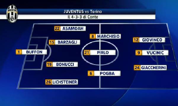 JUVENTUS TORINO ULTIMISSIME FORMAZIONI – Vista l’assenza di Giorgio Chiellini, in base a quanto raccoglie Sky Sport, Antonio Conte potrebbe decidere di schierare un 4-3-3 accantonando quindi la retroguardia a 3. Lichtsteiner giocherebbe a destra mentre a sinistra giocherebbe Asamoah. Di seguito la probabile formazione.