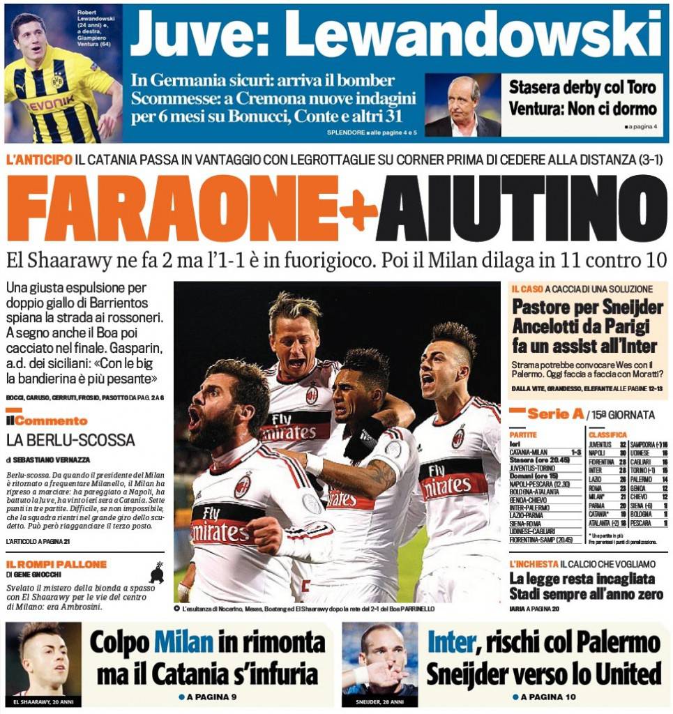 Rassegna Stampa: Juve Lewandowski! Milan, Faraone + aiutino, Sneijder-Pastore si può… 01/12/2012 di admin RASSEGNA STAMPA JUVENTUS INTER MILAN – Di seguito i principali titoli dei tre quotidiani sportivi, Tuttosport, Gazzetta dello Sport e Corriere dello Sport, riguardanti le tre big, Inter, Milan e Juventus. La redazione di Calciomercatonews.com