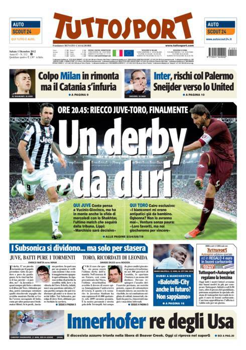 Tuttosport: Un derby da duri 01/12/2012 di Admin3 TUTTOSPORT DERBY – Juventus-Torino, il derby ritorna, in campo alle ore 20.45. La redazione di Calciomercatonews.com