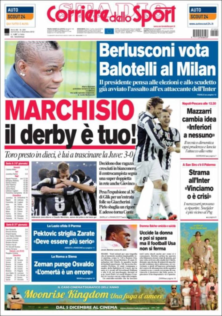JUVENTUS TORINO MARCHISIO – Con il Torino presto in dieci, è Marchisio a trascinare la Juventus verso il 3-0. Decidono due ragazzi cresciuti in bianconero: il centrocampista segna una super doppietta, in rete anche Giovinco. Pesa l’espulsione al 36′ di Glik per un’entrata folle su Giaccherini. Pirlo sbaglia un rigore. E adesso torna Conte. Belusconi vota Balotelli al Milan.