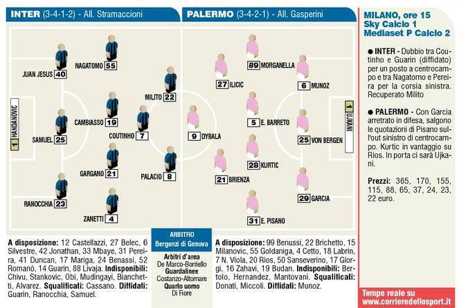 INTER PALERMO PROBABILI FORMAZIONI – Di seguito potete osservare le probabili formazioni di Inter-Palermo firmate Gazzetta dello Sport. Il match si terrà questo pomeriggio alle ore 15.00 allo stadio San Siro e sarà valido per il quindicesimo turno della Serie A. Non rientra nei convocati Wesley Sneijder, ancora out per la nota querelle legata al rinnovo del contratto. Stramaccioni dovrebbe confermare il 3-5-2 delle ultime uscite con la coppia d’attacco formata da Diego Milito e Rodrigo Palacio, anche se non è da escludere lo schieramento di un 3-4-1-2 più “coperto”. Assente ancora Antonio Cassano, ancora squalificato.