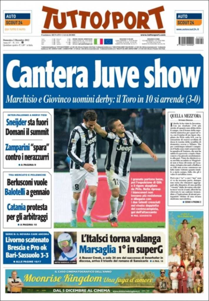 JUVENTUS TORINO DERBY – Marchisio e Giovinco uomini derby: il Toro in dieci si arrende (3-0). I granata partono bene, poi l’espulsione di Glik e il rigore sbagliato da Pirlo. Nella ripresa, i bianconeri npn trovano più resistenza e dilagano con i due talenti cresciuti nel vivaio: doppietta del centrocampista, gol dell’attaccante.