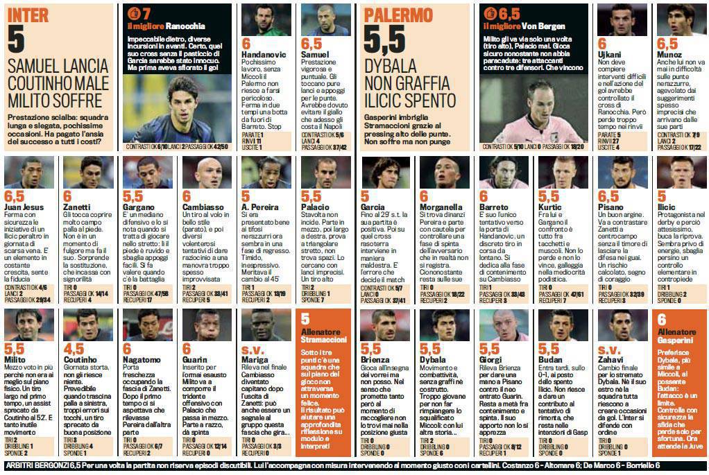 INTER PALERMO VOTI PAGELLE GAZZETTA – Di seguito potete visionare i voti e le pagelle Gazzetta dello Sport relativi alla sfida fra l’Inter e il Palermo, gara valevole per la quindicesima giornata di Serie A e conclusasi con il risultato di 1 a 0 in favore dei padroni di casa. Il migliore dell’incontro in assoluto è stato Andrea Ranocchia, bravo e attento in difesa, ma anche pericoloso in fase offensiva. Deludono invece Coutinho (4.5) e Pereira (voto 5). In casa rosanero il migliore è il difensore Von Bergen.