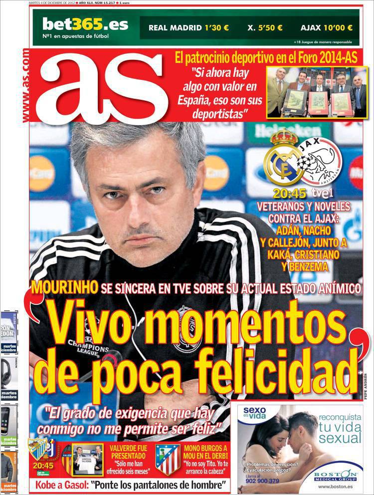 As: “Vivo momenti di poca felicità” 04/12/2012 di Admin3 AS MOURINHO – Sul quotidiano As si parla di Mourinho che rivela di avere pochi momenti di felicità. La redazione di Calciomercatonews.com