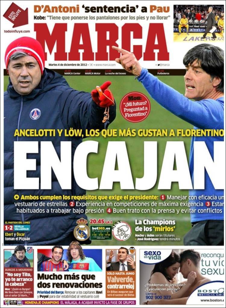 Marca: Encajan 04/12/2012 di Admin3 MARCA ANCELOTTI LOW – Si fanno già i nomi dei sostituti di Mourinho, si parla di Ancelotti o di Low. La redazione di Calciomercatonews.com