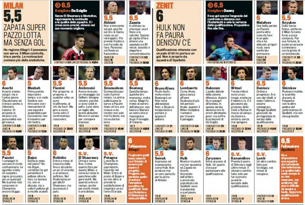 MILAN ZENIT VOTI PAGELLE GAZZETTA – Poco più in basso potrete consultare le pagelle e i voti di Milan-Zenit di San Pietroburgo firmati Gazzetta dello Sport. La partita, valida per il sesto turno dei Gironi di Champions League, si è giocata ieri sera a San Siro e si è conclusa con il risultato di 0 a 1 in favore dello Zenit, in gol con Danny. Il migliore dell’incontro è stato Mattia De Sciglio mentre fra le fila russe ottima gara dell’autore della rete. Molto bene anche Zapata mentre male Bojan.