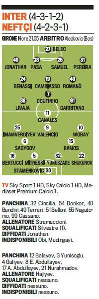 INTER NEFTCI PROBABILI FORMAZIONI – Poco più in basso potete visionare le probabili formazioni di Inter-nefcti, firmate Gazzetta dello Sport, match valevole per il sesto ed ultimo turno dei Gironi di Europa League e che si giocherà questa sera in quel del San Siro. Vista la qualificazione ai sedicesimi di finale già in tasca mister Stramaccioni dovrebbe puntare su una formazione ampiamente rimaneggiata composta da molti giovani talenti della Primavera e da giocatore scarsamente utilizzati da agosto ad oggi.