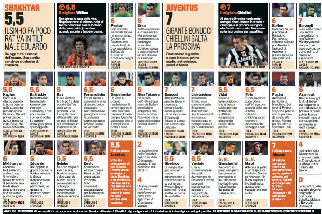 SHAKHTAR DONETSK JUVENTUS VOTI PAGELLE GAZZETTA – Di seguito potete visionare i voti e le pagelle Gazzetta dello Sport relativi alla sfida fra la Juventus e lo Shakhtar Donetsk, gara valevole per il sesto ed ultimo turno dei Gironi di Champions League e conclusasi con il risultato di 0 a 1 in favore dei bianconeri. Il migliore dell’incontro in assoluto è stato Chiellini, un vero lottatore (voto 7). Molto bene anche il resto della retroguardia mentre l’unica insufficienza è stata di Giovinco (5,5).