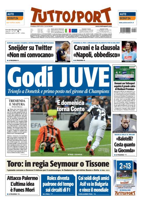 Tuttosport: Godi Juve 06/12/2012 di Admin3 TUTTOSPORT JUVENTUS – Su Tuttosport si parla della Juventus che è agli ottavi di Champions League come prima classificata. La redazione di Calciomercatonews.com