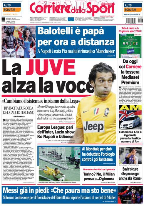 Corriere dello Sport: La Juve alza la voce 07/12/2012 di Admin3 CORRIERE JUVENTUS – Sul Corriere dello Sport si parla della Juventus che vuole cambiare la Lega Calcio. La redazione di Calciomercatonews.com