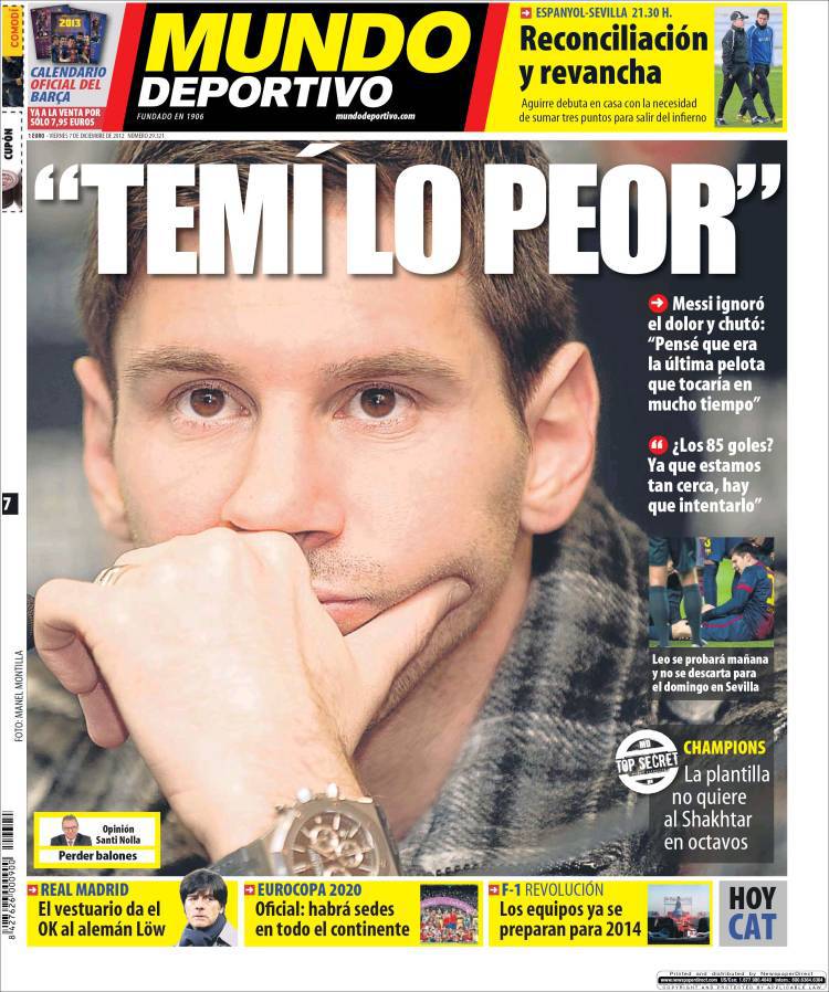 Mundo Deportivo: Ho temuto il peggio 07/12/2012 di Admin3 MUNDO DEPORTIVO MESSI – Sul quotidiano Mundo Deportivo parla Messi che ha temuto di aver subito un grave infortunio. La redazione di Calciomercatonews.com