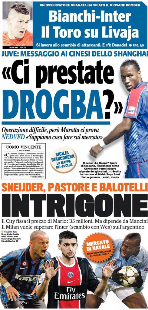 Rassegna stampa: La Juve chiede Drogba al Chelsea, Pastore-Balotelli, derby Milan-Inter – Foto 08/12/2012 di admin RASSEGNA STAMPA – Di seguito i principali titoli dei tre quotidiani sportivi Gazzetta dello Sport, Tuttosport e Corriere dello Sport, relativi alle tre big Milan, Inter e Juventus. La redazione di Calciomercatonews.com